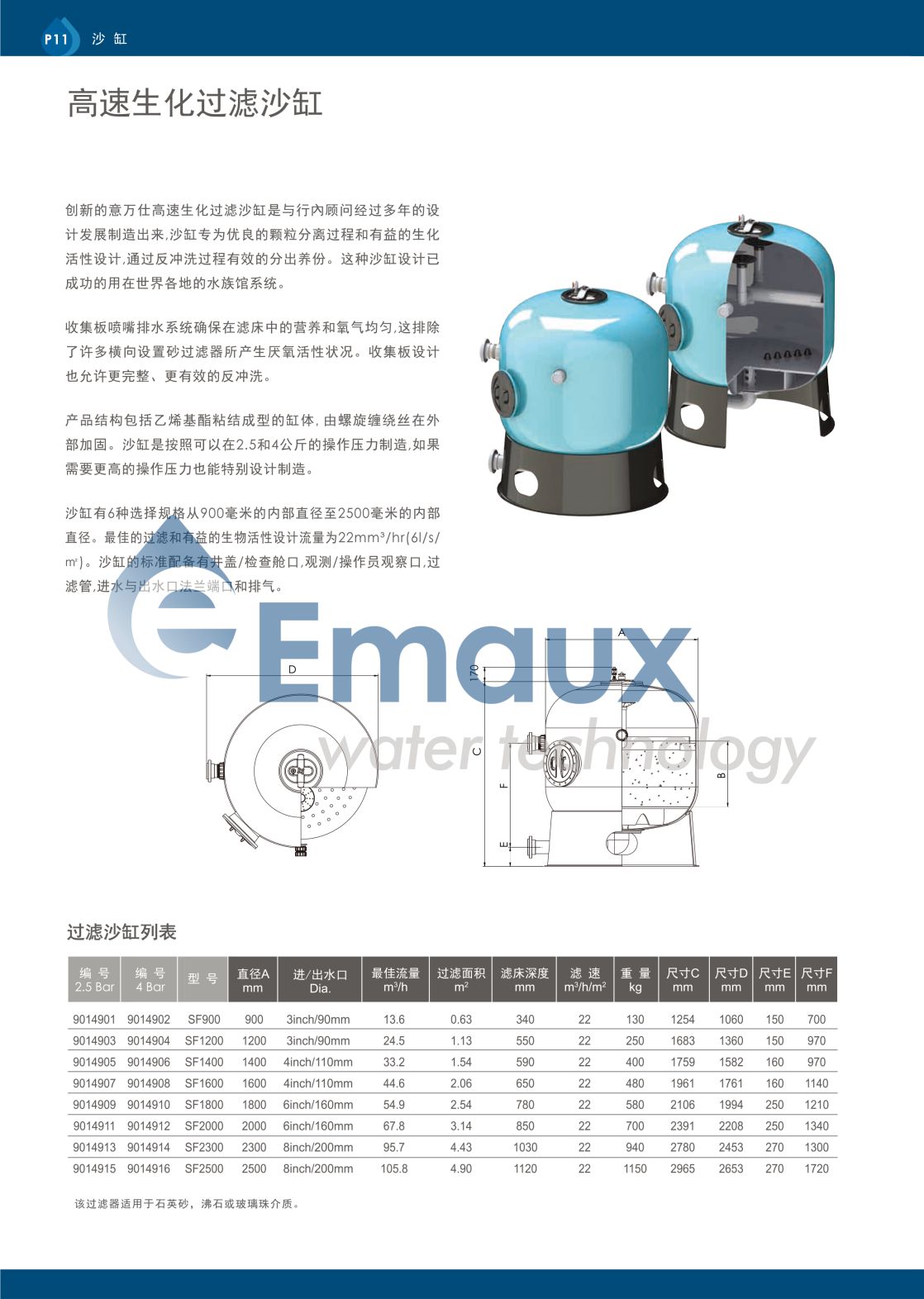 競(jìng)技池創(chuàng)新的意萬(wàn)仕高速生化過(guò)濾沙缸是與行內(nèi)顧問(wèn)經(jīng)過(guò)多年的設(shè)計(jì)發(fā)展制造出來(lái),沙缸專為優(yōu)良的顆粒分離過(guò)程和有益的生化活性設(shè)計(jì)通過(guò)反沖洗過(guò)程有效的分出養(yǎng)份。 這種沙缸設(shè)計(jì)已成功的用在世界各地的水族館系統(tǒng)。 收集板噴嘴排水系統(tǒng)確保在濾床中的營(yíng)養(yǎng)和氧氣均勻,這排除了許多橫向設(shè)置砂過(guò)濾器所產(chǎn)生厭氧活性狀況。 收集板設(shè)計(jì)也允許更完整、更有效的反沖洗。 產(chǎn)品結(jié)構(gòu)包括乙烯基酷粘結(jié)成型的缸體, 由螺旋纏繞絲在外部加固。 沙缸是按照可以在2.5和4公斤的操作壓力制造,如果需要更高的操作壓力也能特別設(shè)計(jì)制造。 沙缸有6種選擇規(guī)格從900毫米的內(nèi)部直徑至2500毫米的內(nèi)部 直徑。 最佳的過(guò)濾和有益的生物活性設(shè)計(jì)流量為22mm3/hr(61/s/ m')。 沙缸的標(biāo)準(zhǔn)配備有井蓋/檢查艙口觀測(cè)/操作員觀察口過(guò) 濾管進(jìn)水與出水口法蘭端口和排氣。