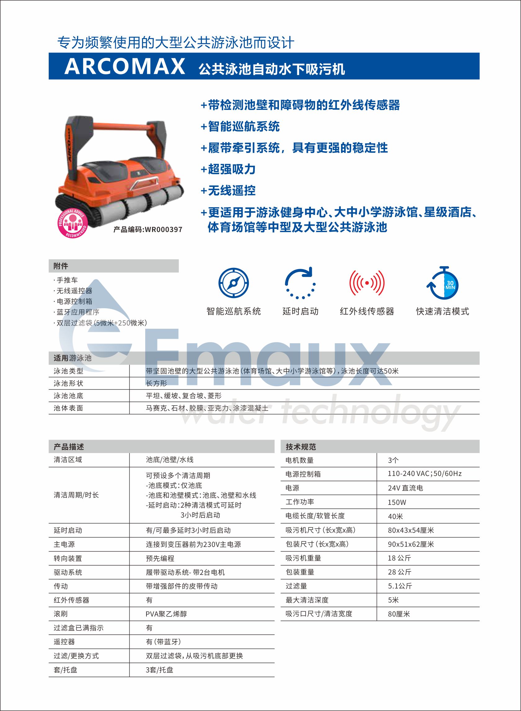 ★氣旋抽吸技術(shù)+超強(qiáng)吸污能力 ★雙層過(guò)濾袋 ★滾軸牽引系統(tǒng),更適合頻繁使用 ★帶檢測(cè)池壁和障礙物的紅外線傳感器 ★無(wú)線遙控,能手動(dòng)能定點(diǎn)操作清潔 ★智能巡航系統(tǒng) ★配有手推車,使用更方便 ★更適用于游泳健身中心,大中小學(xué)游泳館,星級(jí)酒店,體育館等中型及大型公共游泳池