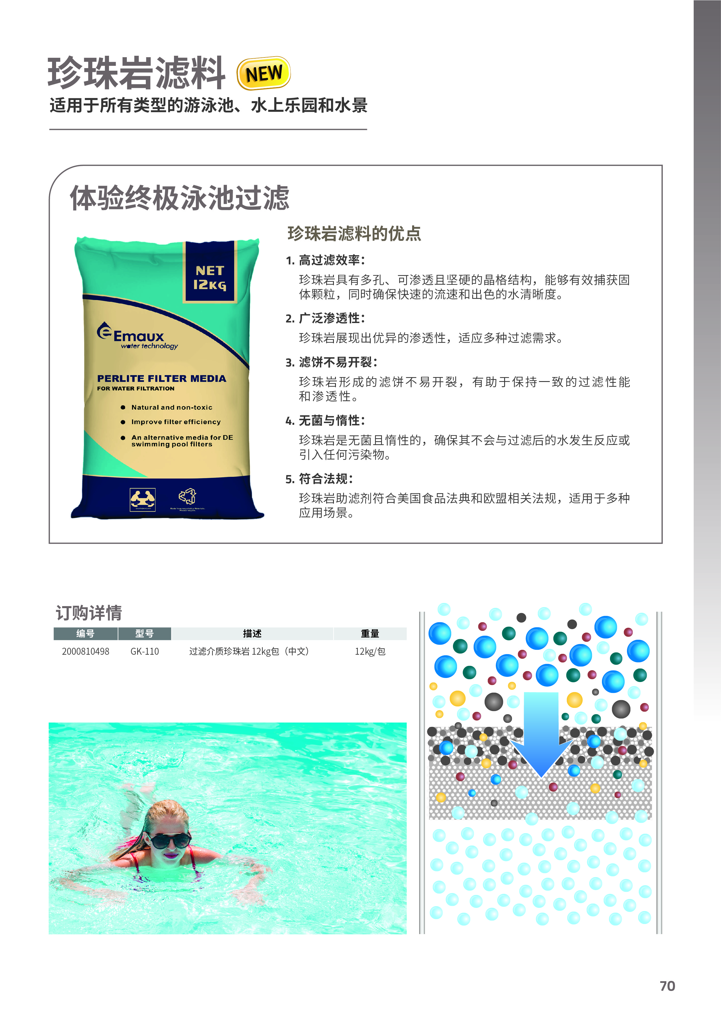 珍珠巖濾料的優(yōu)點: 1.?過濾效率: 珍珠巖具有多孔、可滲透且堅硬的晶格結構,能夠有效捕獲固 體顆粒,同時確??焖俚牧魉俸统錾乃逦?。 2.廣泛滲透性: 珍珠巖展現出優(yōu)異的滲透性,適應多種過濾需求。 3.濾餅不易開裂: 珍珠巖形成的濾餅不易開裂,有助于保持一致的過濾性能 和滲透性。 4.無菌與惰性: 珍珠巖是無菌且惰性的,確保其不會與過濾后的水發(fā)生反應或 引入任何污染物。 5.符合法規(guī): 珍珠巖助濾劑符合美國食品法典和歐盟相關法規(guī),適用于多種 應用場景。