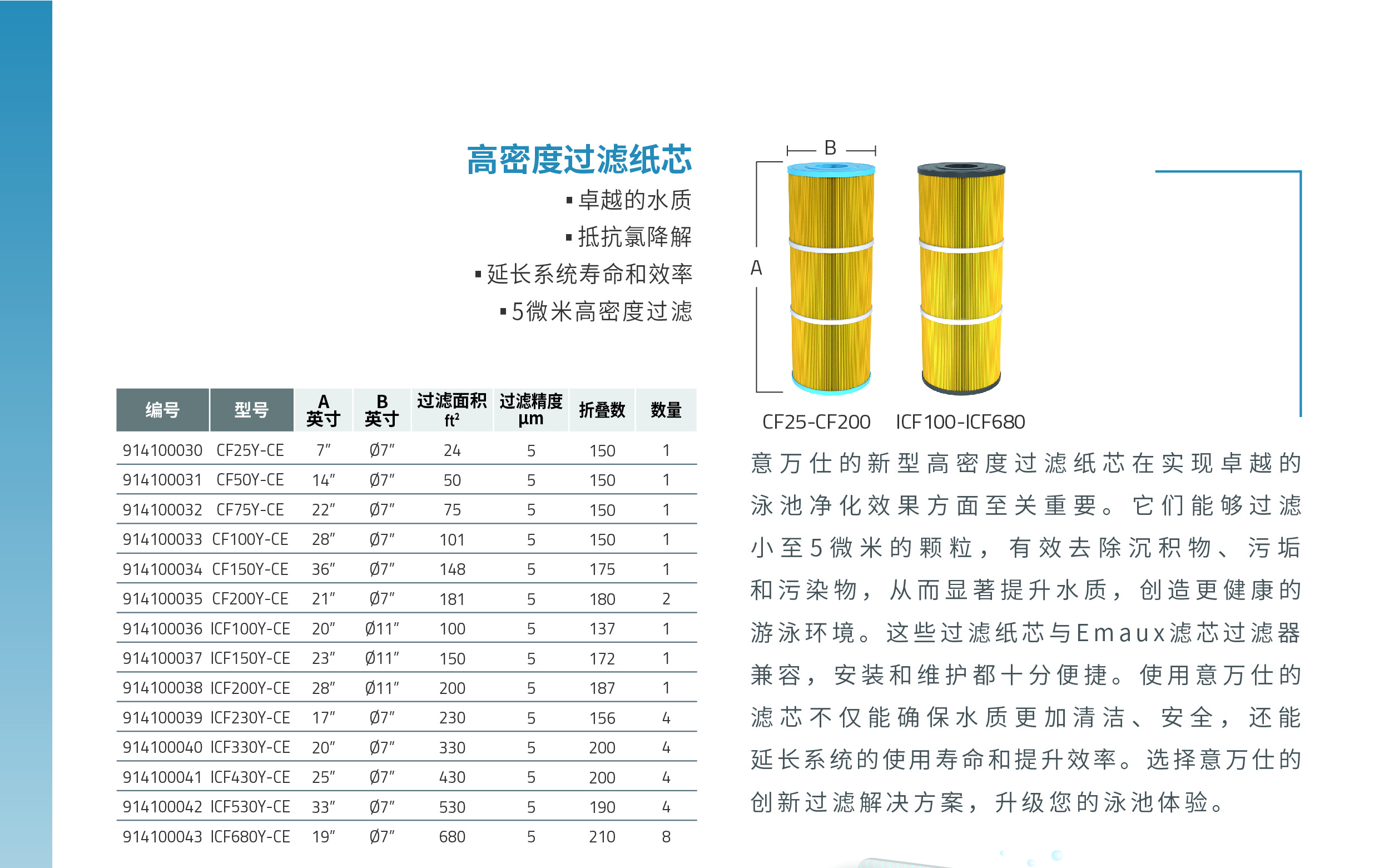 意萬仕的新型高密度過濾紙芯在實現(xiàn)卓越的 泳池凈化效果方面至關(guān)重要。它們能夠過濾 小至5微米的顆粒,有效去除沉積物、污垢 和污染物,從而顯著提升水質(zhì),創(chuàng)造更健康的 游泳環(huán)境。這些過濾紙芯與Emaux濾芯過濾器 兼容,安裝和維護(hù)都十分便捷。使用意萬仕的 濾芯不僅能確保水質(zhì)更加清潔、安全,還能 延長系統(tǒng)的使用壽命和提升效率。選擇意萬仕的 創(chuàng)新過濾解決方案,升級您的泳池體驗。