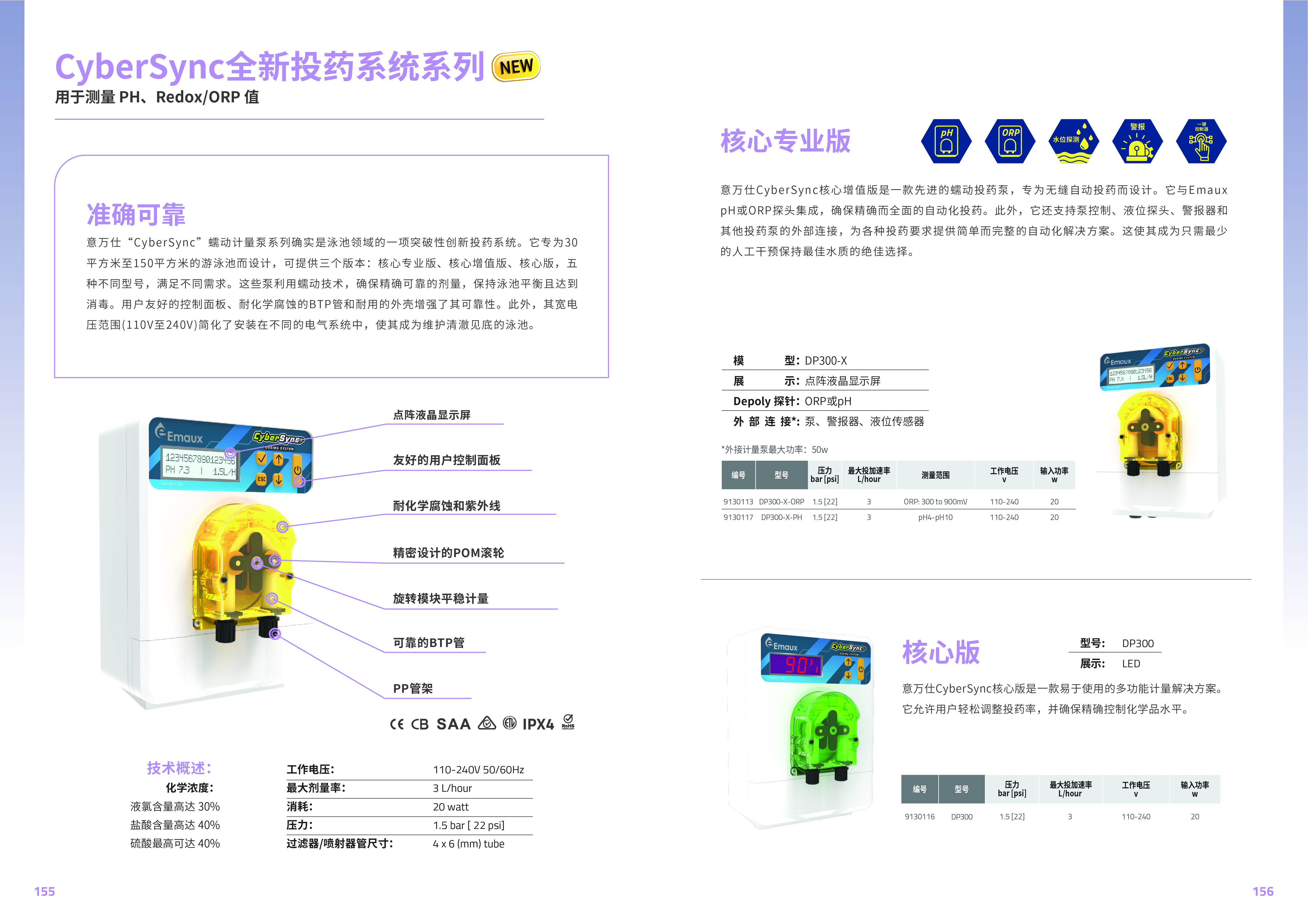 意萬仕“CyberSync”蠕動計(jì)量泵系列確實(shí)是泳池領(lǐng)域的一項(xiàng)突破性創(chuàng)新投藥系統(tǒng)。它專為30 平方?至150平方?的游泳池?設(shè)計(jì),可提供三個版本:核心專業(yè)版、核心增值版、核心版,五 種不同型號,滿足不同需求。這些泵利用蠕動技術(shù),確保精確可靠的劑量,保持泳池平衡且達(dá)到 消毒。用戶友好的控制?板、耐化學(xué)腐蝕的BTP管和耐用的外殼增強(qiáng)了其可靠性。此外,其寬電 壓范圍(110V至240V)簡化了安裝在不同的電?系統(tǒng)中,使其成為維護(hù)清澈見底的泳池。