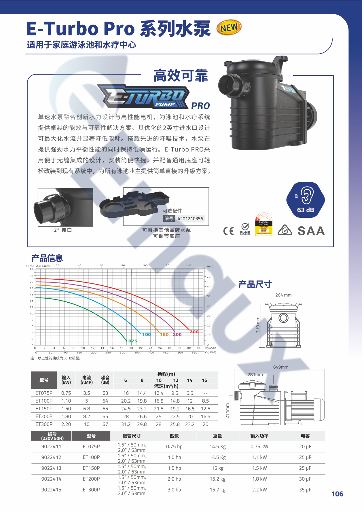 單速水泵融合創(chuàng)新水力設(shè)計(jì)與高性能電機(jī),為泳池和水療系統(tǒng) 提供卓越的能效與可靠性解決方案。其優(yōu)化的2英寸進(jìn)水口設(shè)計(jì) 可最大化水流并顯著降低能耗。搭載先進(jìn)的降噪技術(shù),水泵在 提供強(qiáng)勁水力平衡性能的同時(shí)保持低噪運(yùn)行。E-Turbo PRO采 用便于無(wú)縫集成的設(shè)計(jì),安裝簡(jiǎn)便快捷,并配備通用底座可輕 松改裝到現(xiàn)有系統(tǒng)中,為所有泳池業(yè)主提供簡(jiǎn)單直接的升級(jí)方案。