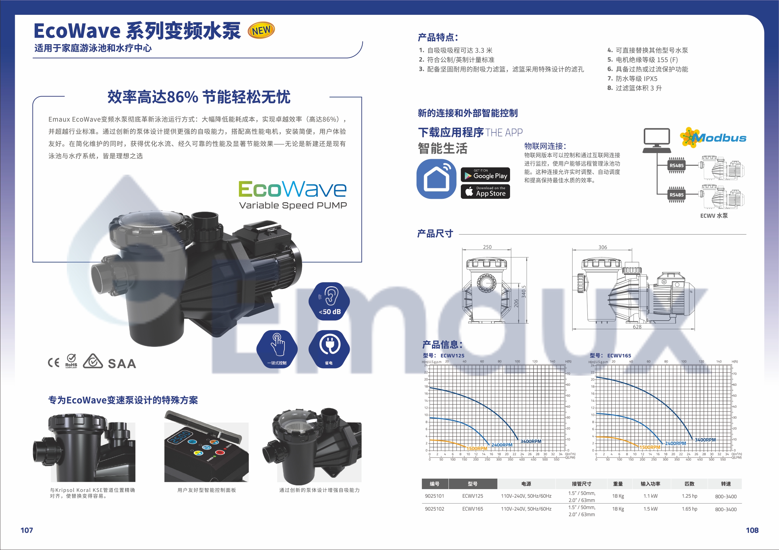 Emaux EcoWave變頻水泵徹底革新泳池運(yùn)行方式:大幅降低能耗成本,實(shí)現(xiàn)卓越效率(高達(dá)86%),并超越行業(yè)標(biāo)準(zhǔn)。通過(guò)創(chuàng)新的泵體設(shè)計(jì)提供更強(qiáng)的自吸能力,搭配高性能電機(jī),安裝簡(jiǎn)便,用戶體驗(yàn)友好。在簡(jiǎn)化維護(hù)的同時(shí),獲得優(yōu)化水流、經(jīng)久可靠的性能及顯著節(jié)能效果——無(wú)論是新建還是現(xiàn)有泳池與水療系統(tǒng),皆是理想之選