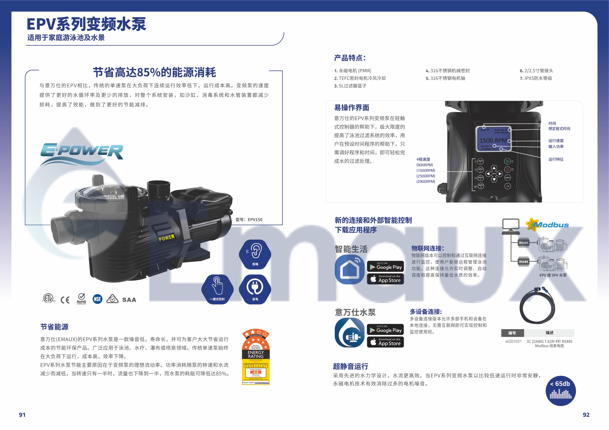 與意萬(wàn)仕的EPV相比,傳統(tǒng)的單速泵在大負(fù)荷下連續(xù)運(yùn)行效率低下運(yùn)行成本高。變頻泵的速度提供了更好的水循環(huán)率及更少的排放,對(duì)整個(gè)系統(tǒng)安裝,如沙缸,消毒系統(tǒng)和水管裝置都減少損耗,提高了效能,做到了更好的節(jié)能減排。