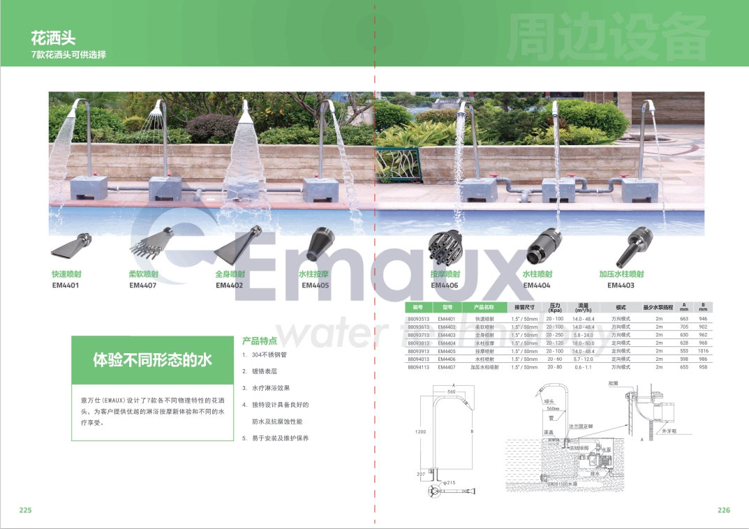 競(jìng)技池意萬仕(EMAUX)設(shè)計(jì)了7款各不同物理特性的花灑頭,為客戶提供優(yōu)越的淋浴按摩新體驗(yàn)和不同的水療享受。