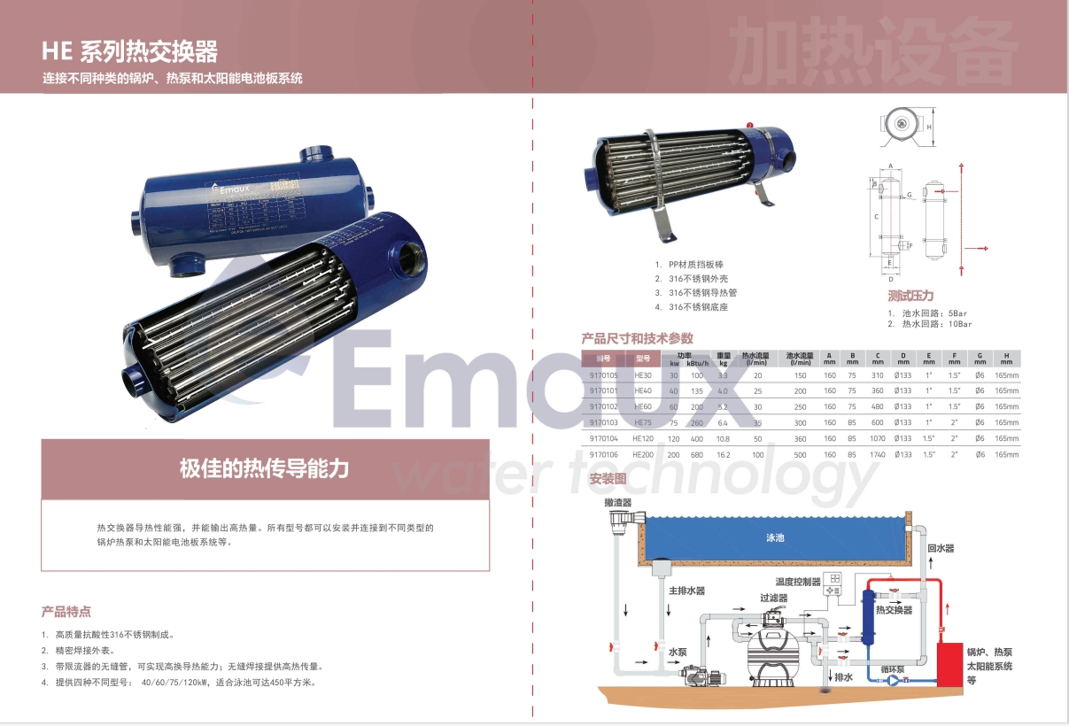 競技池熱交換器導熱性能強,并能輸出高熱量。所有型號都可以安裝并連接到不同類型的鍋爐熱泵和太陽能電池板系統(tǒng)等。